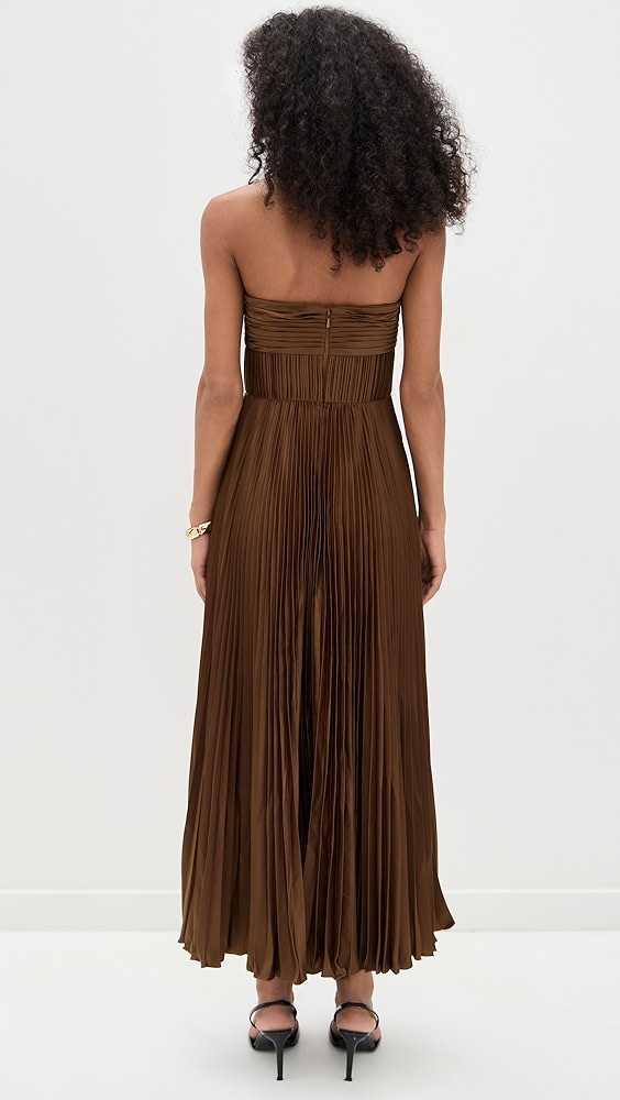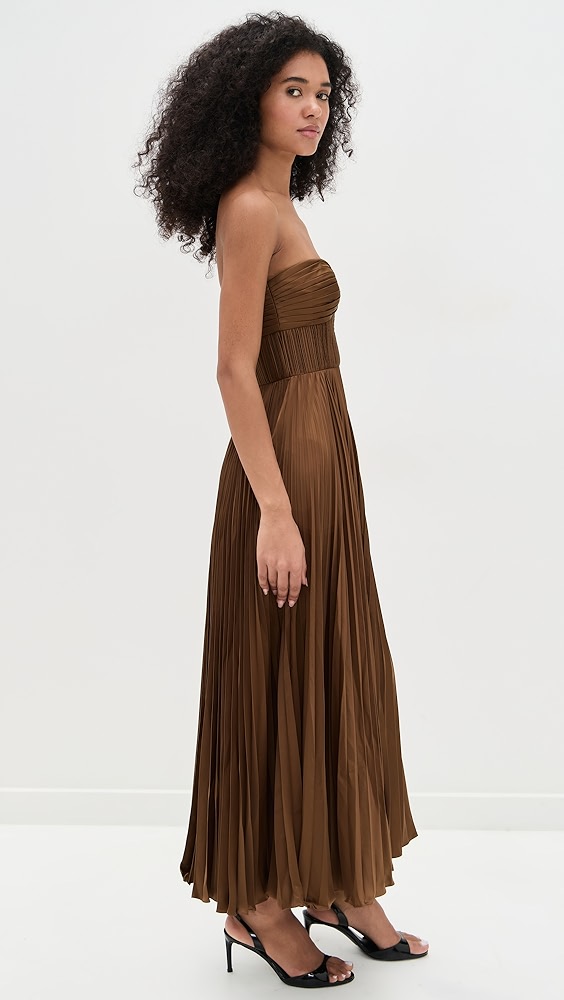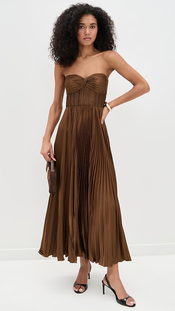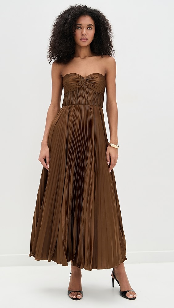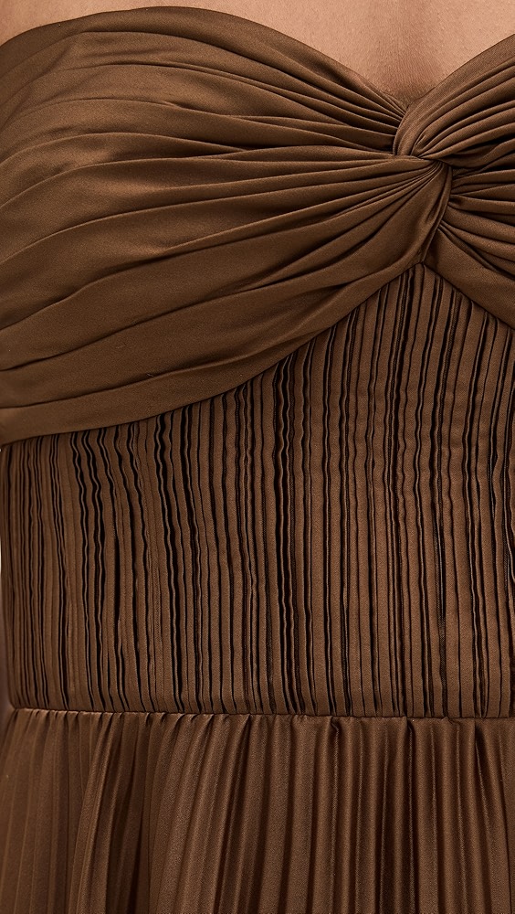 Fabric Stretch: Non-Stretch ranging from Non-Stretch to Super-StretchSuper-Stretch Fabric: Lightweight, non-stretch pleated satin Twisted sweetheart bust Non-slip rubber binding at neckline Maxi length Strapless Sleeveless Hook-and-eye and hidden zip at back Shell: 100% recycled polyester Lined bodice, unlined skirt Dry clean Imported, China Style #AMURR30269