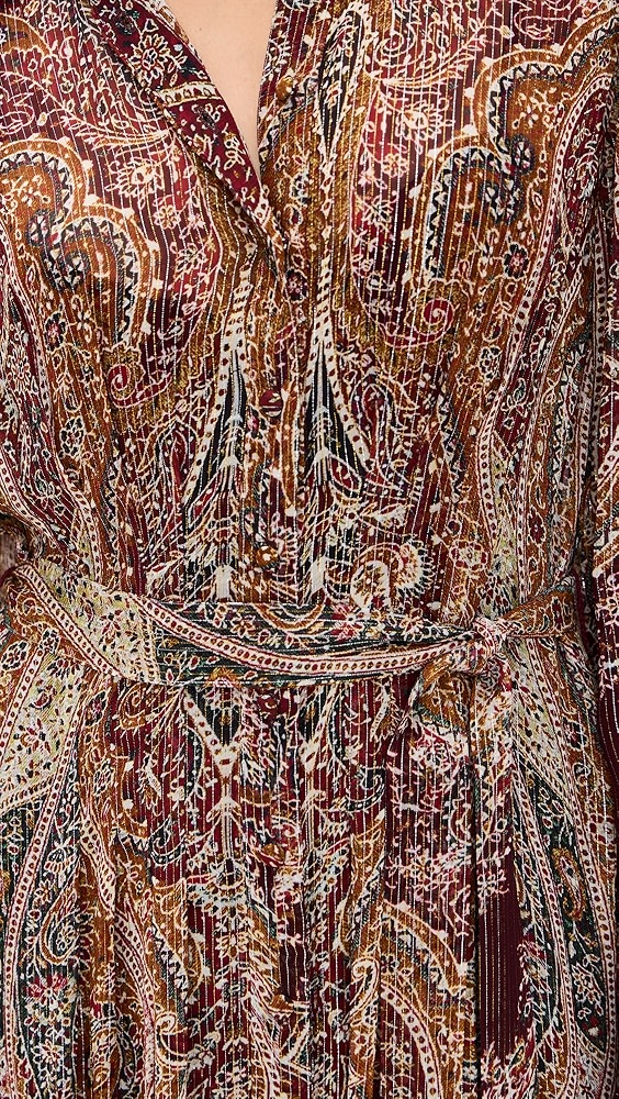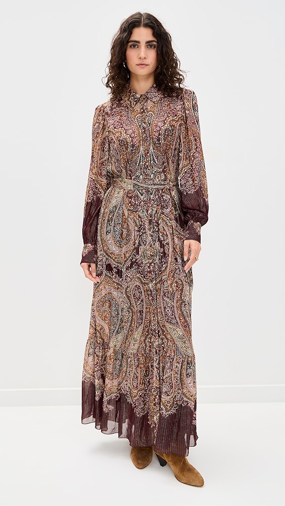 Fabric Stretch: Non-Stretch ranging from Non-Stretch to Super-StretchSuper-Stretch Fabric: Lightweight, non-stretch crisp weave Paisley print and metallic stripes Maxi length Collared neck Long sleeves with button cuffs Button placket Tie self-belt Shell: 96% viscose/4% metallic Optional slip with adjustable straps Lining: 100% viscose Dry clean Imported, India Style #HEMAN30403