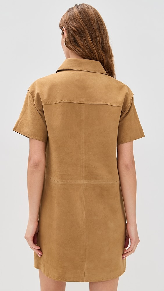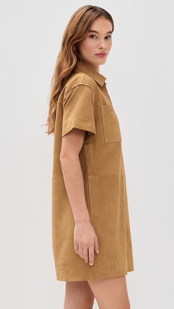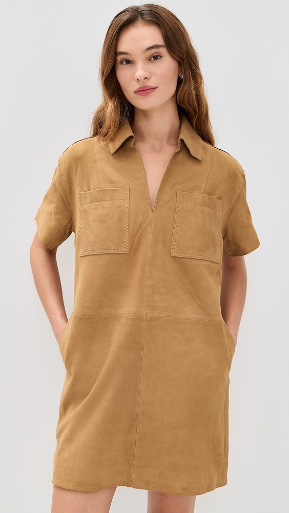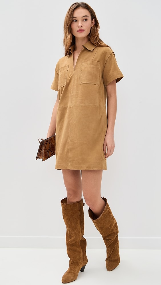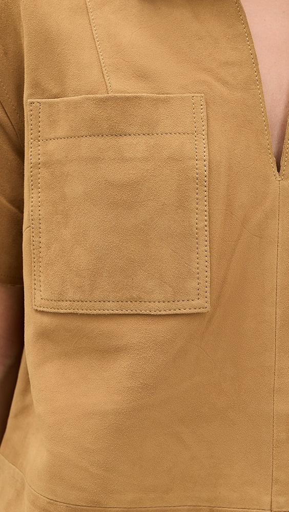 Fabric Stretch: Non-Stretch ranging from Non-Stretch to Super-StretchSuper-Stretch Fabric: Lightweight, non-stretch suede Paneled design Mini length Collared neck Short sleeves Pullover design, no closure Patch breast pocket and on-seam side pockets Shell: 100% goatskin Lined Lining: 100% polyester Leather clean Imported, India Style #TTAYL30789
